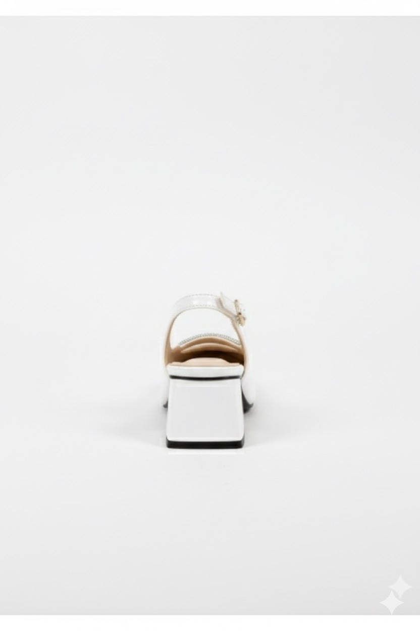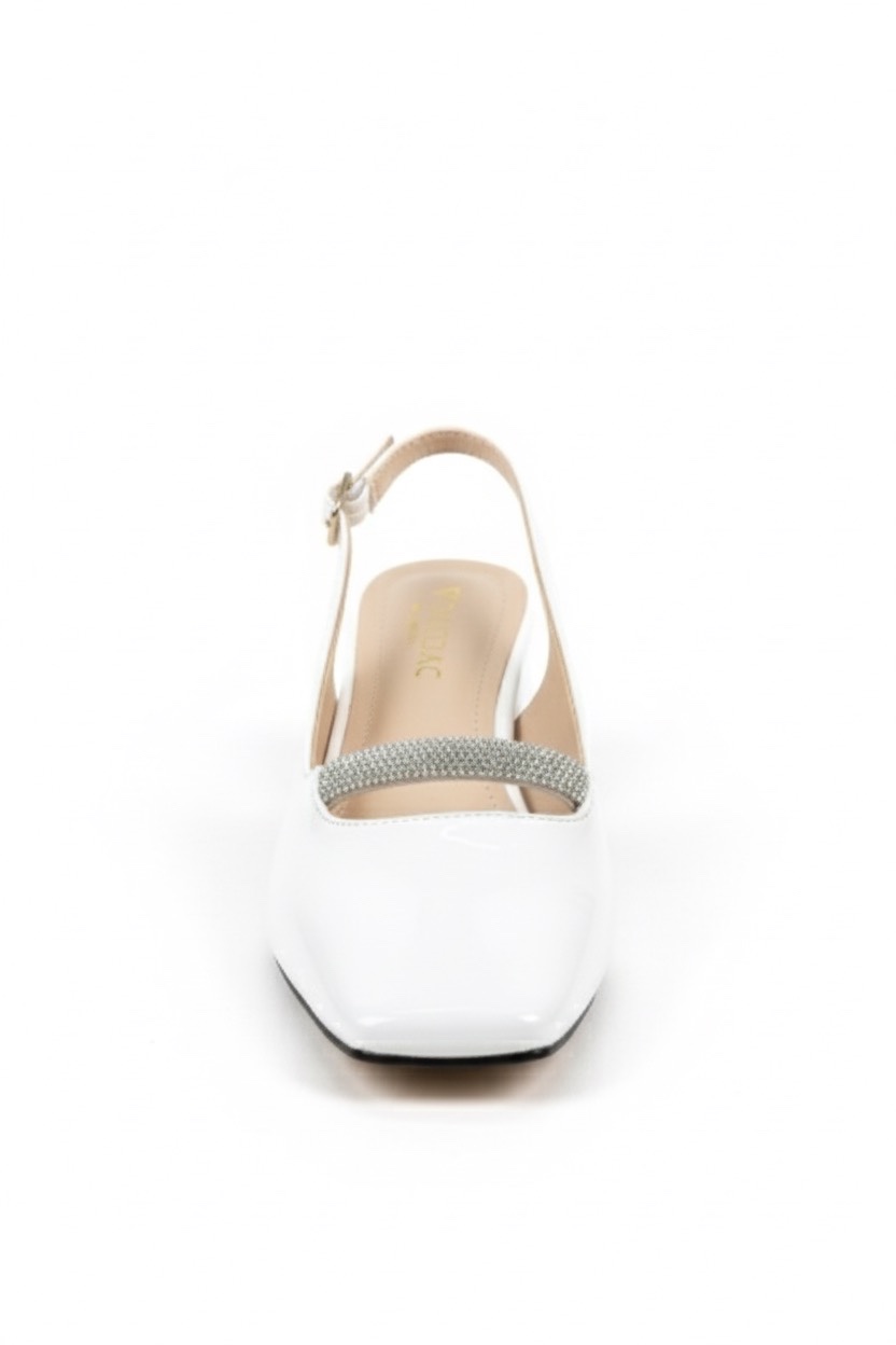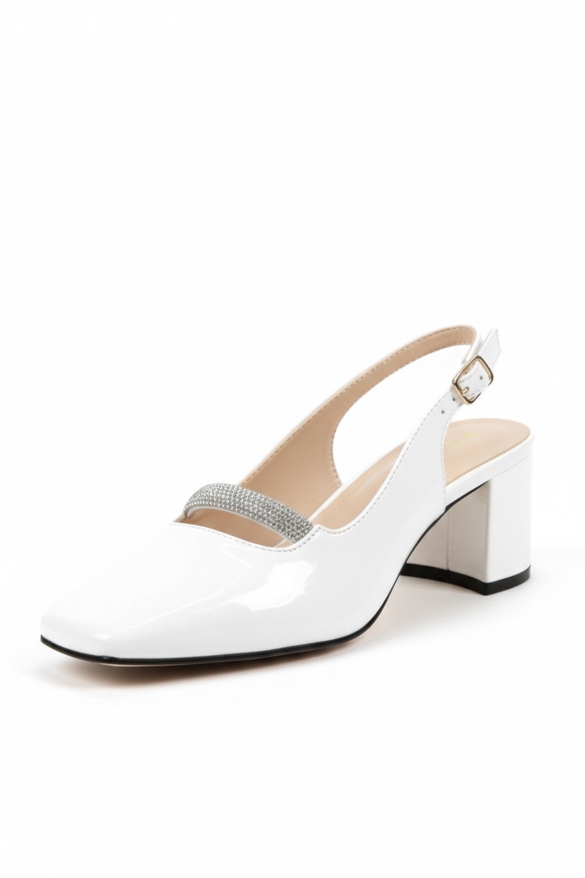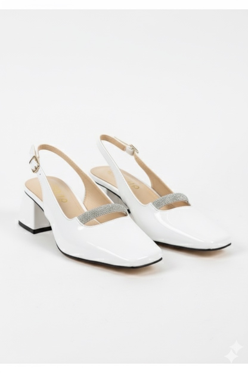 Detaylar: Kare burunlu, önünde simli taş bant detayı bulunan, bilekten ayarlanabilir tokalı ve kalın topuklu şık tasarım.