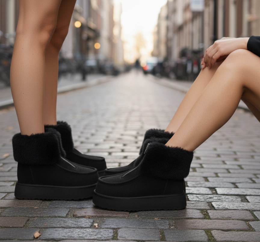 Bu siyah kürklü platform botlar, soğuk kış günlerinde bile zahmetsiz şıklık ve maksimum konfor sunar: