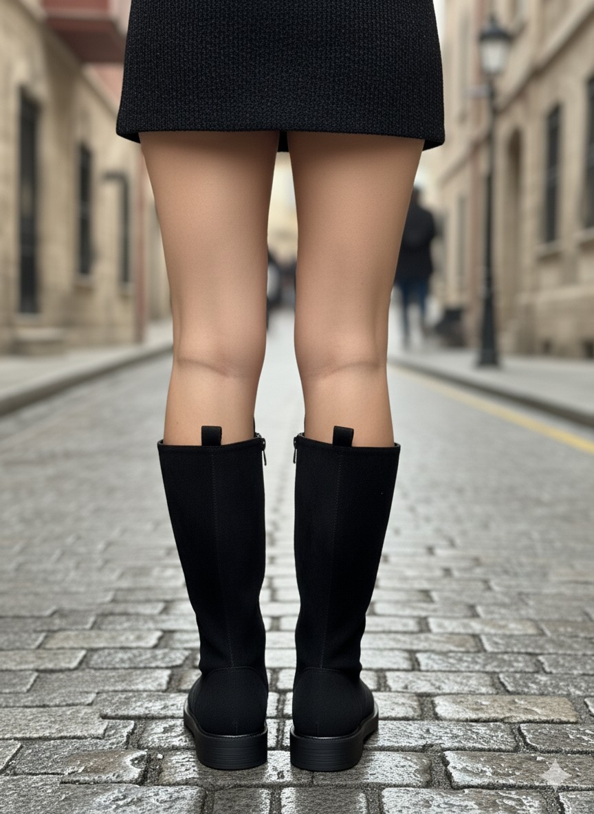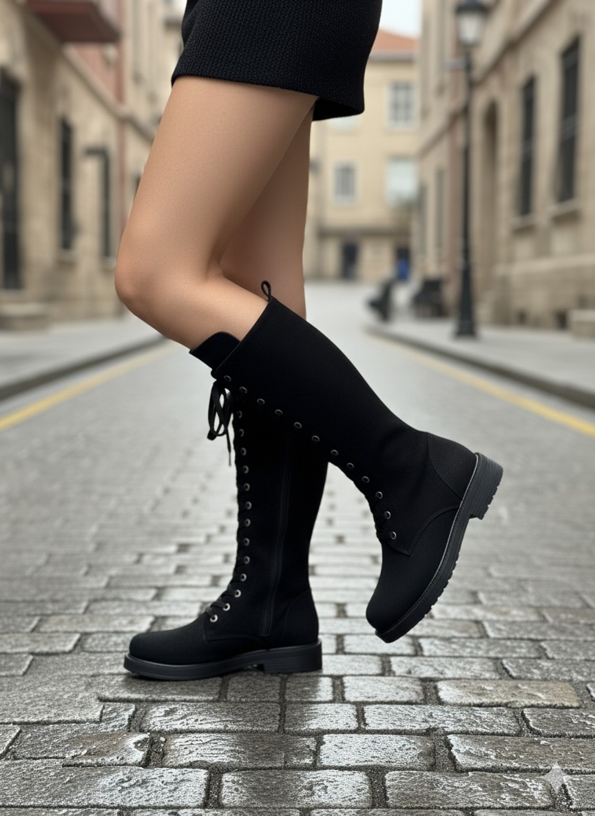 • Gündelik Şıklık: Mini elbise veya şortlar altına opak siyah çoraplarla (Görseldeki gibi) botların uzunluğunu ön plana çıkarın.