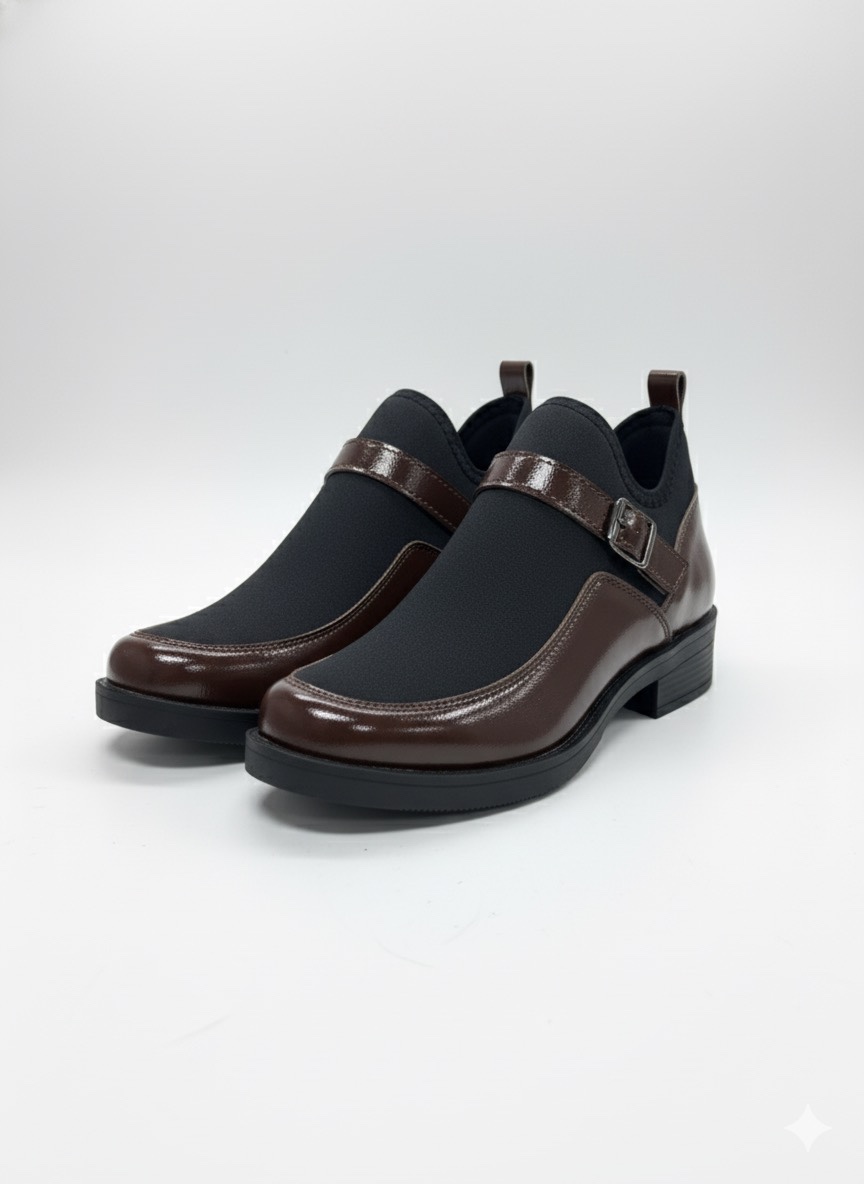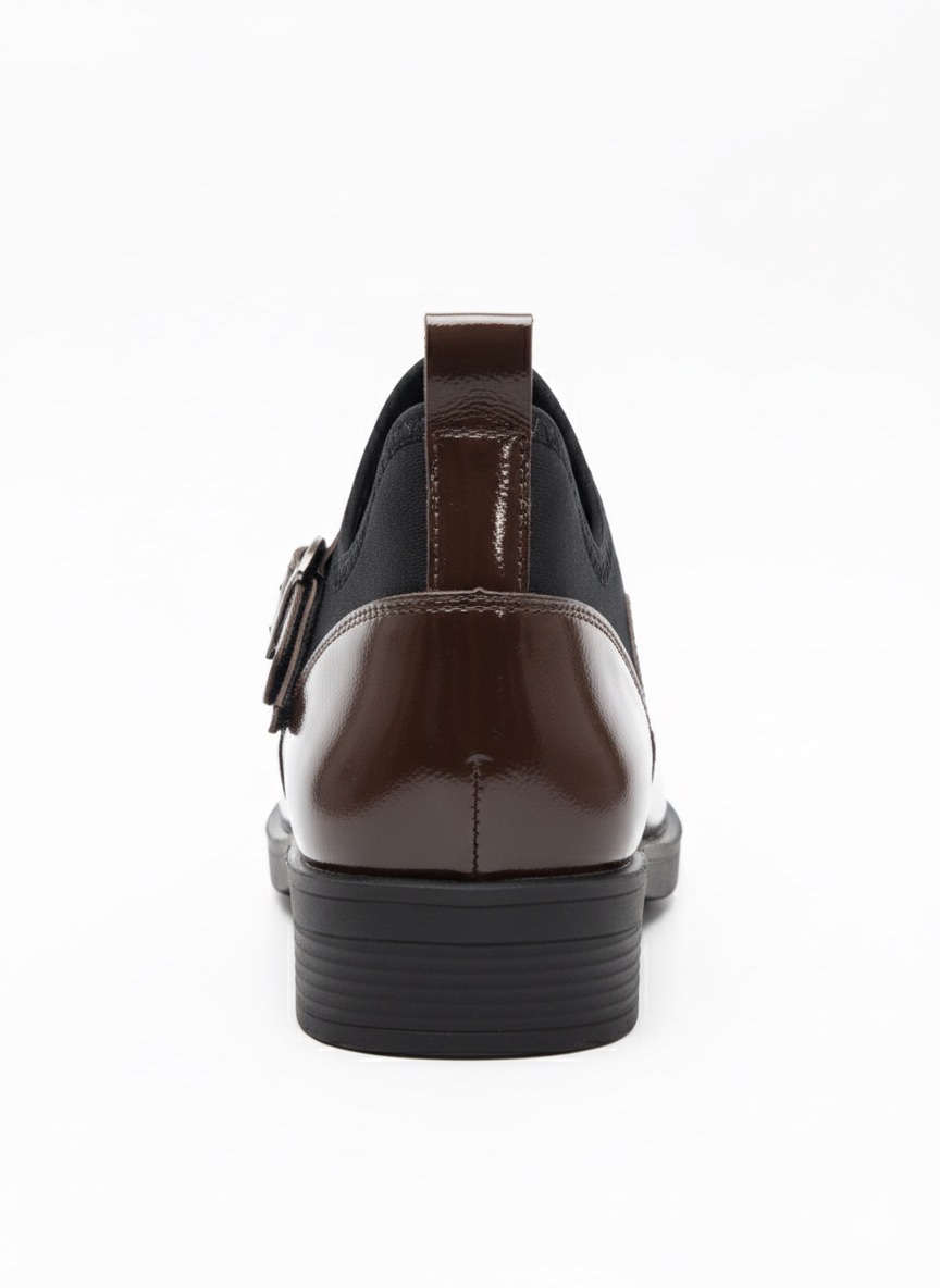 * Materyal Kontrastı: Burun, topuk ve toka şeridi kısımları parlak kahverengi suni deriden, orta ve bilek kısmı ise siyah esnek kumaştan üretilmiştir.