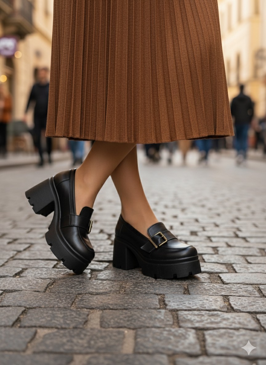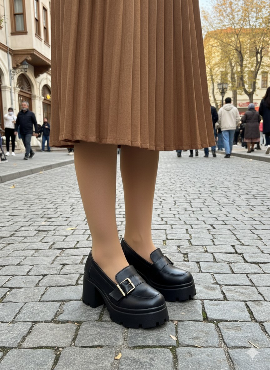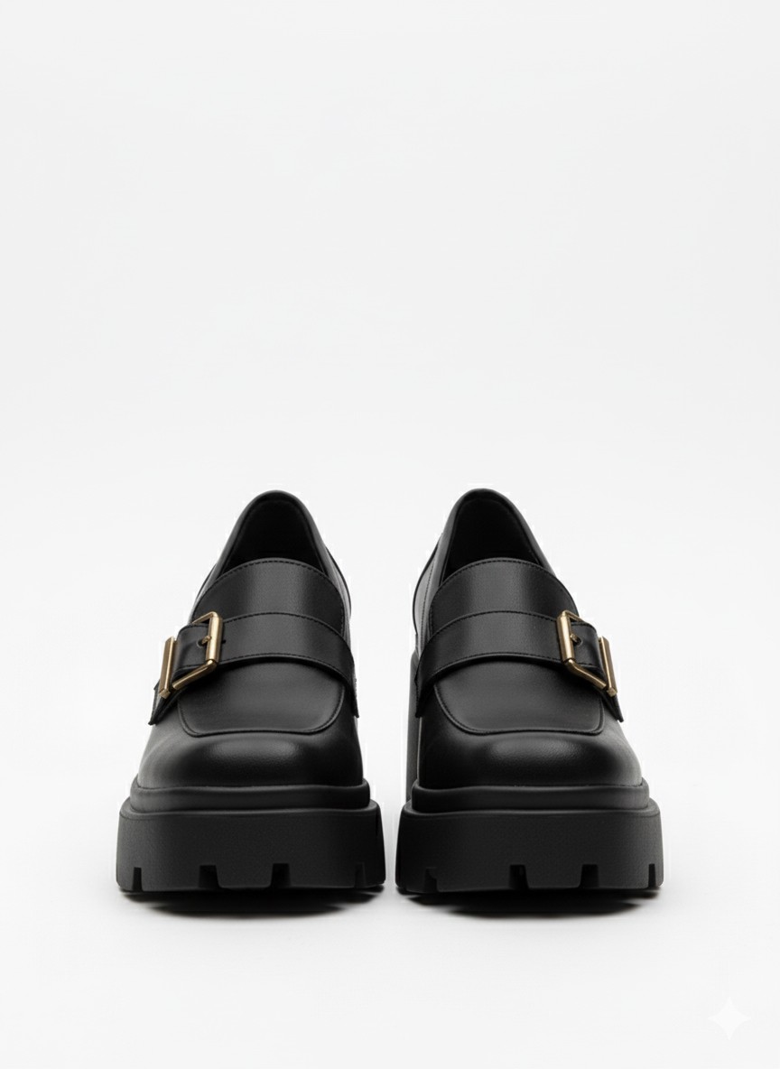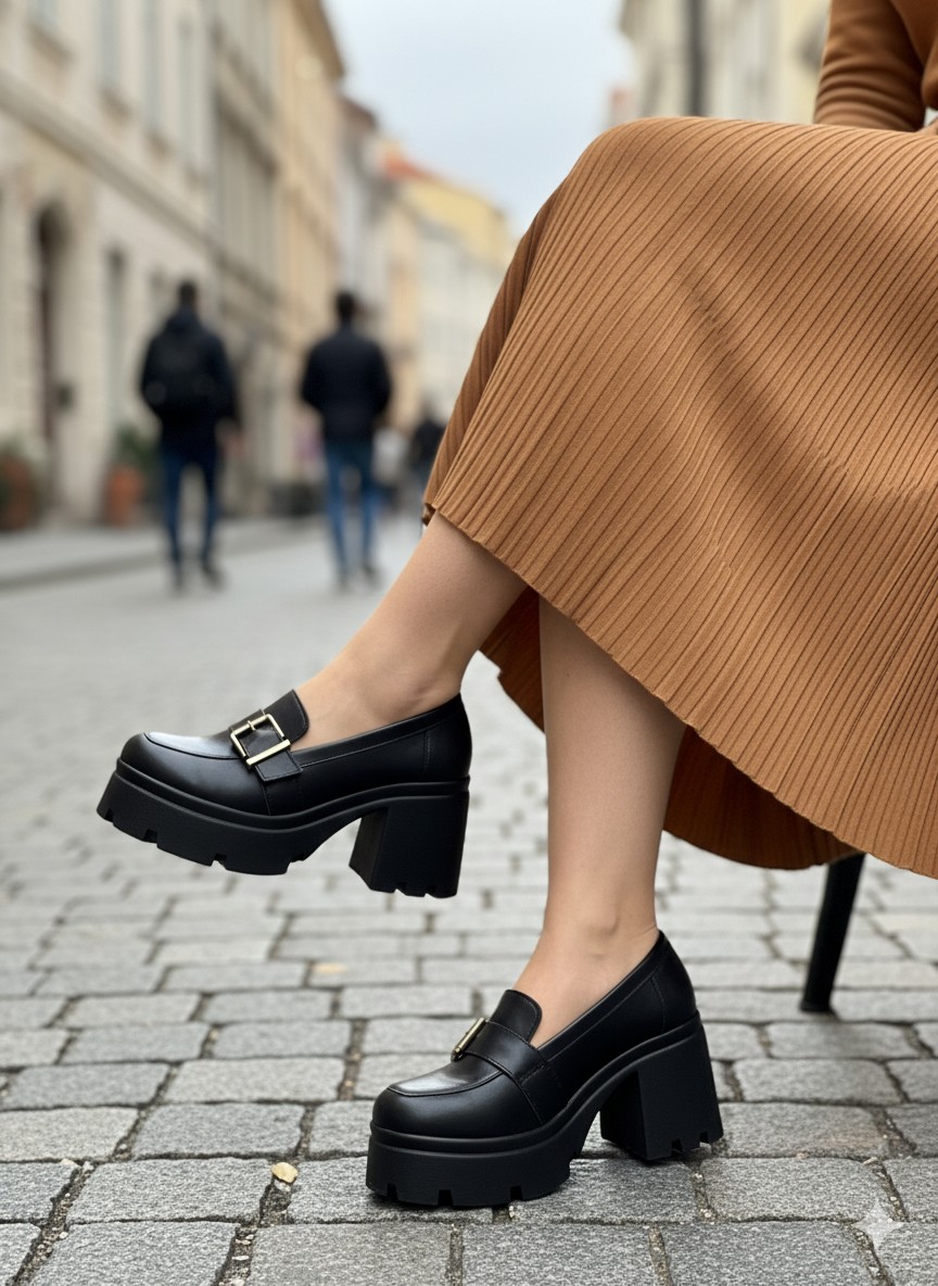 • Detaylar: Üzerinde altın rengi toka detayı bulunan kalın ve tırtıklı tabanlı, topuklu loafer modeli. Şık ve rahat bir tasarıma sahiptir.