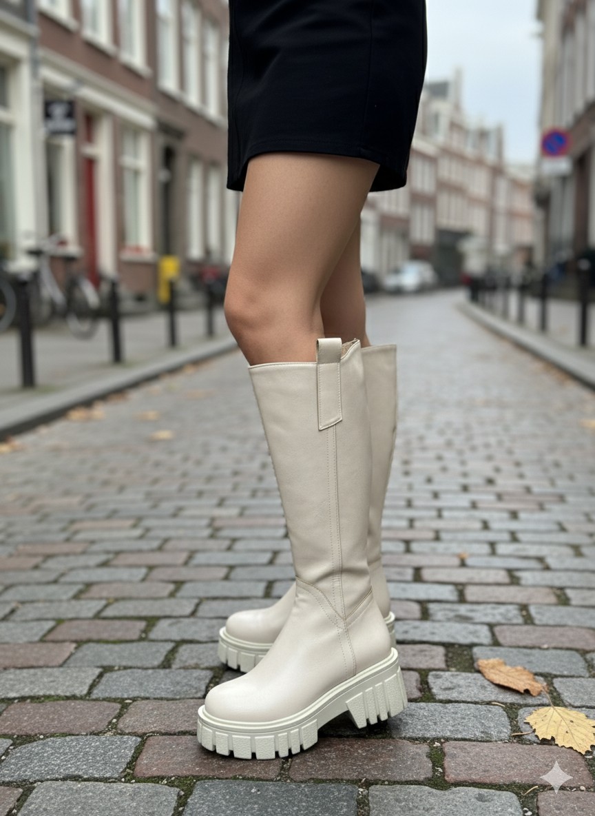Bu krem rengi yüksek çizmeler, kış ve sonbaharda iddialı ve modern bir görünüm yaratmak için idealdir: