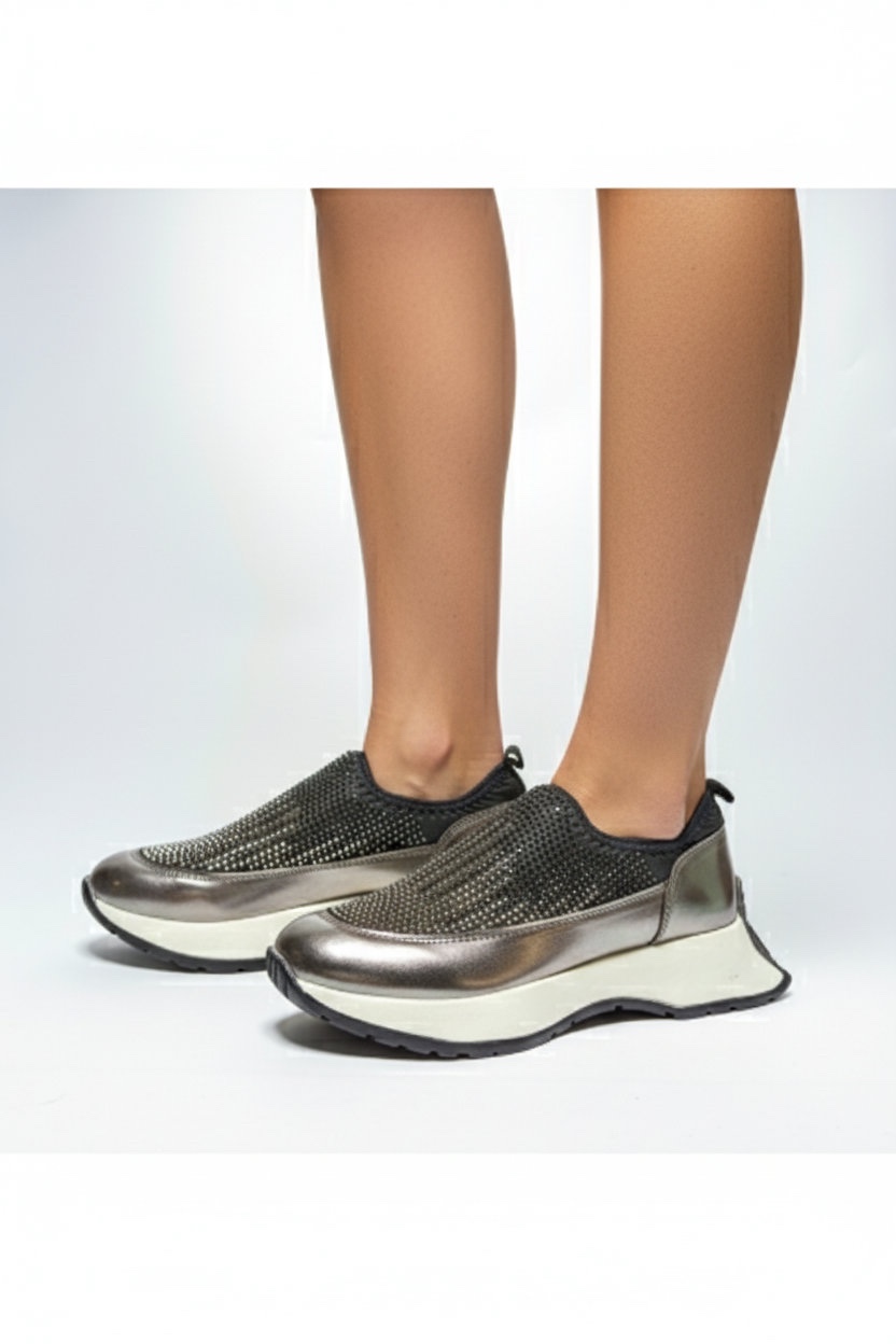 • Detaylar: Ayakkabının üst kısmında, parıltılı taş işlemeli yüzey. Yanlarda ve burun kısmında metalik füme rengi detaylar.