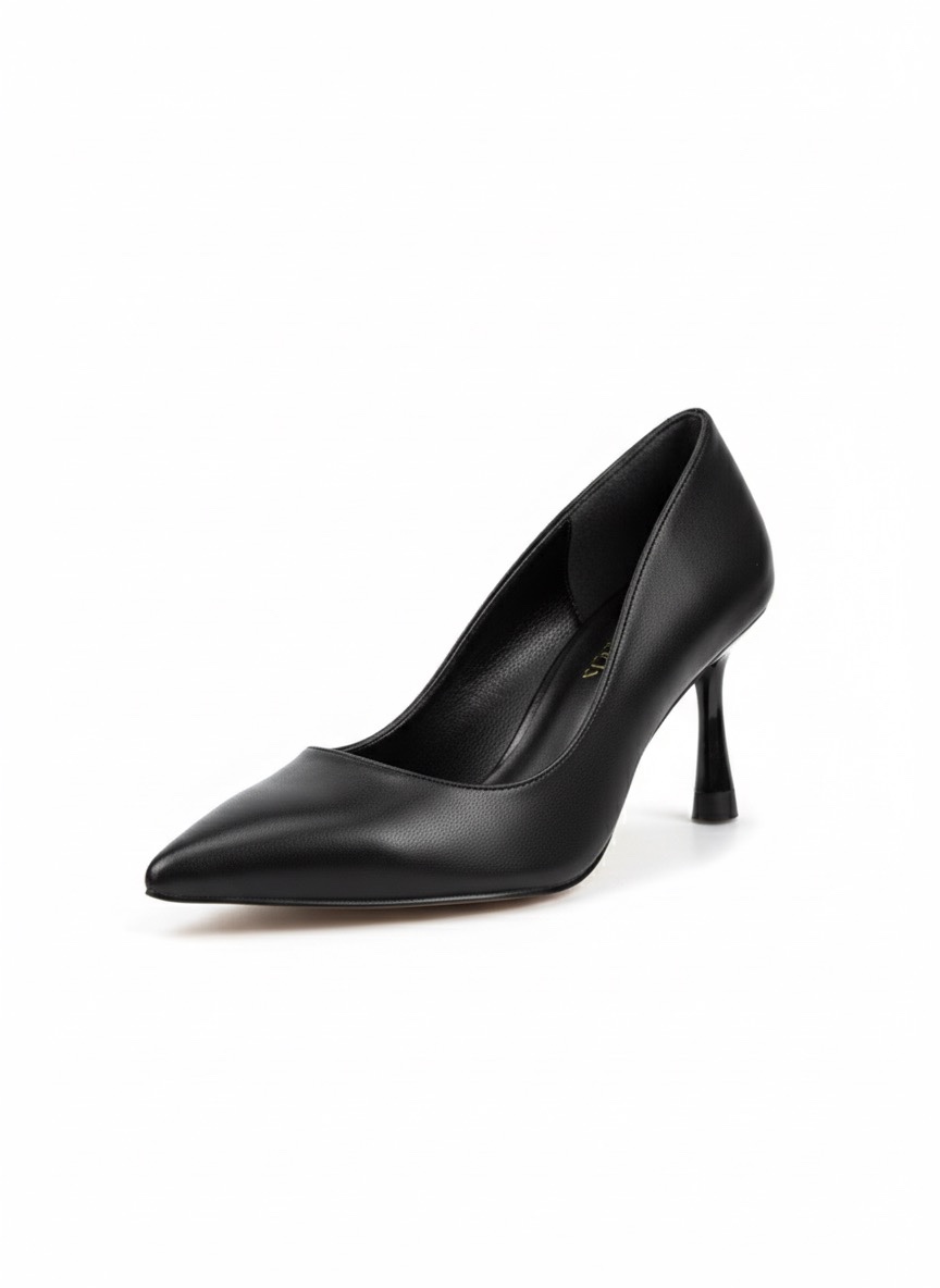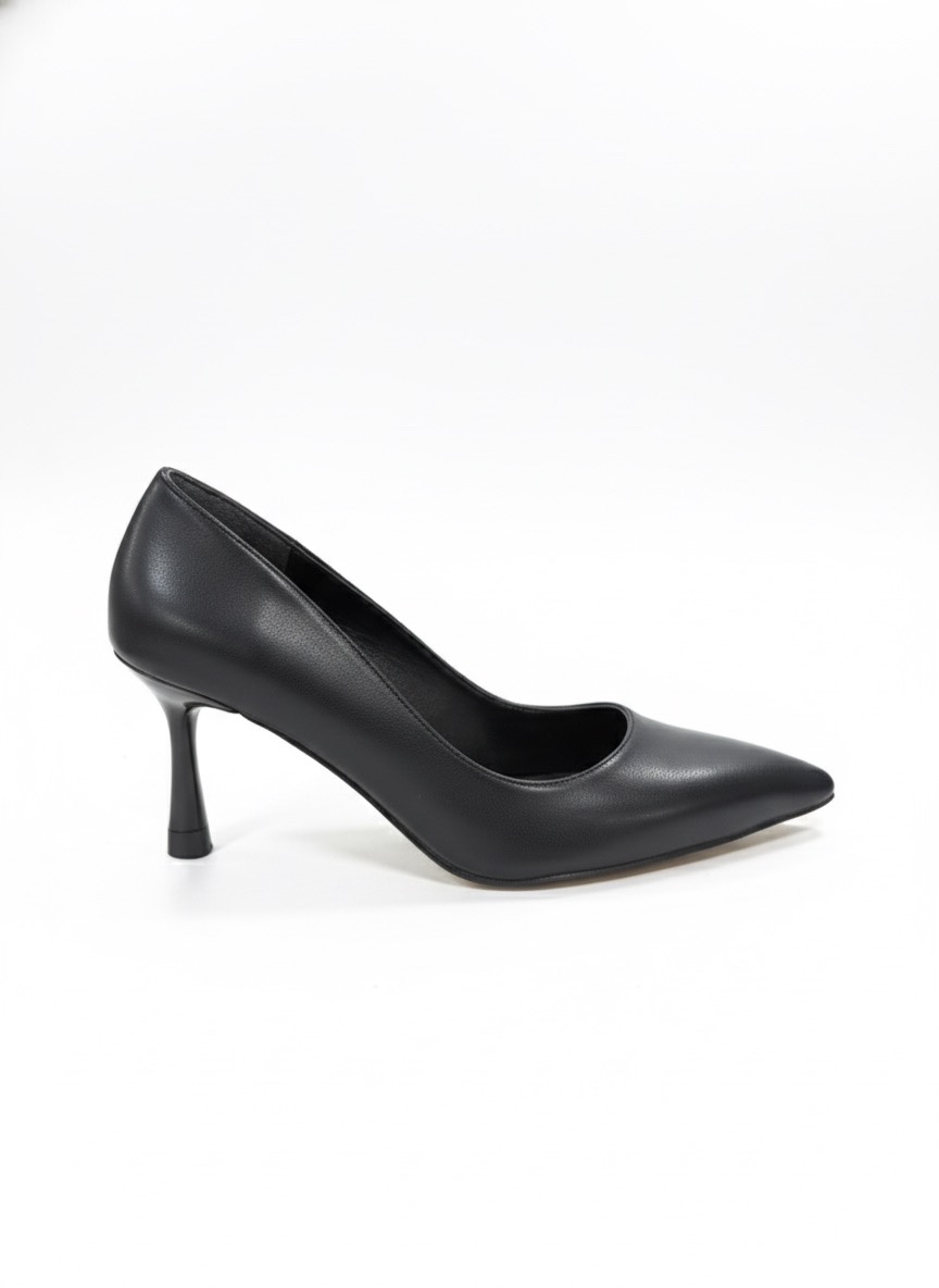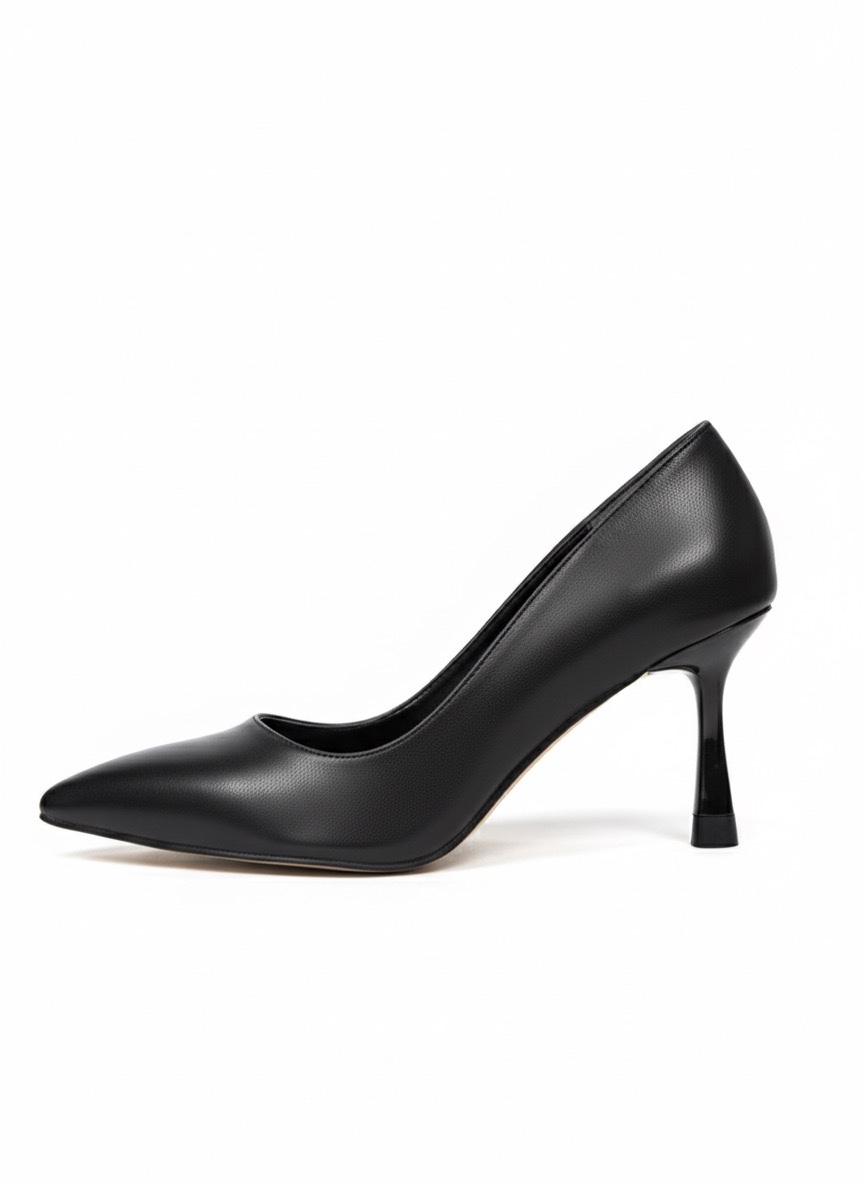 Zamanı aşan şıklığı modern bir dokunuşla birleştiren, mat suni deri dokusu ve dengeli kadeh topuk formuyla konforlu siyah topuklu ayakkabı.