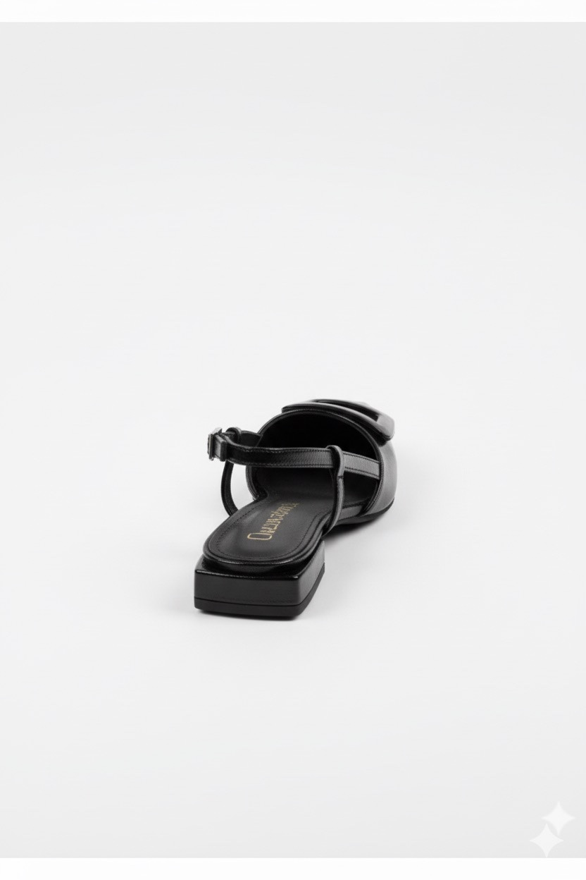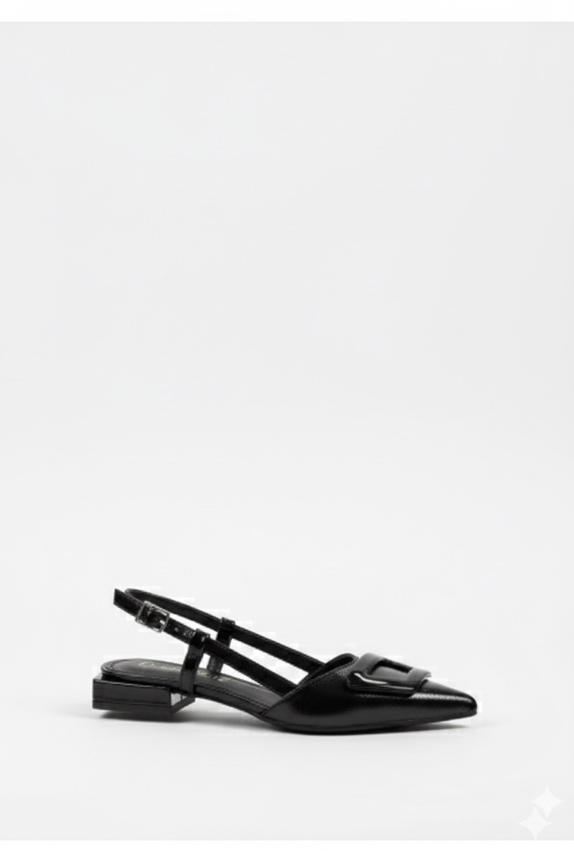 Detaylar: Sivri burunlu, önünde parlak tokalı aksesuar detayı bulunan, bilekten ayarlanabilir tokalı ve kalın, kısa topuklu şık tasarım.