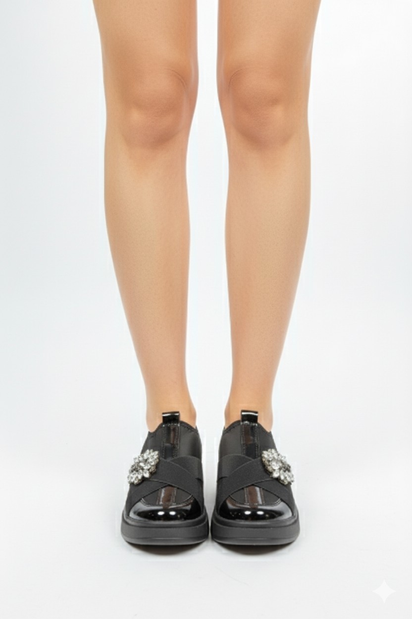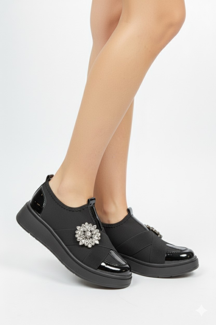 • Detaylar: Ayakkabının üzerinde parlak taşlarla süslenmiş büyük toka detayı, çapraz elastik bantlar, burun kısmında parlak rugan yüzey.