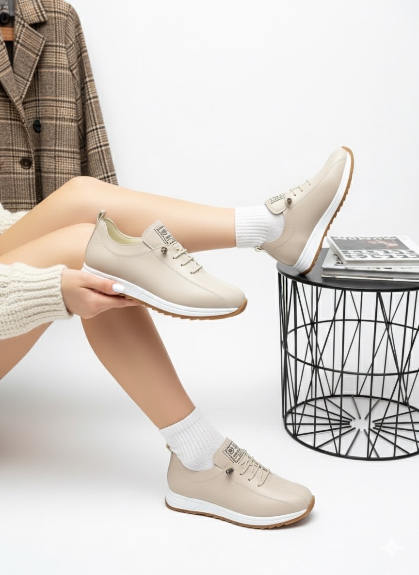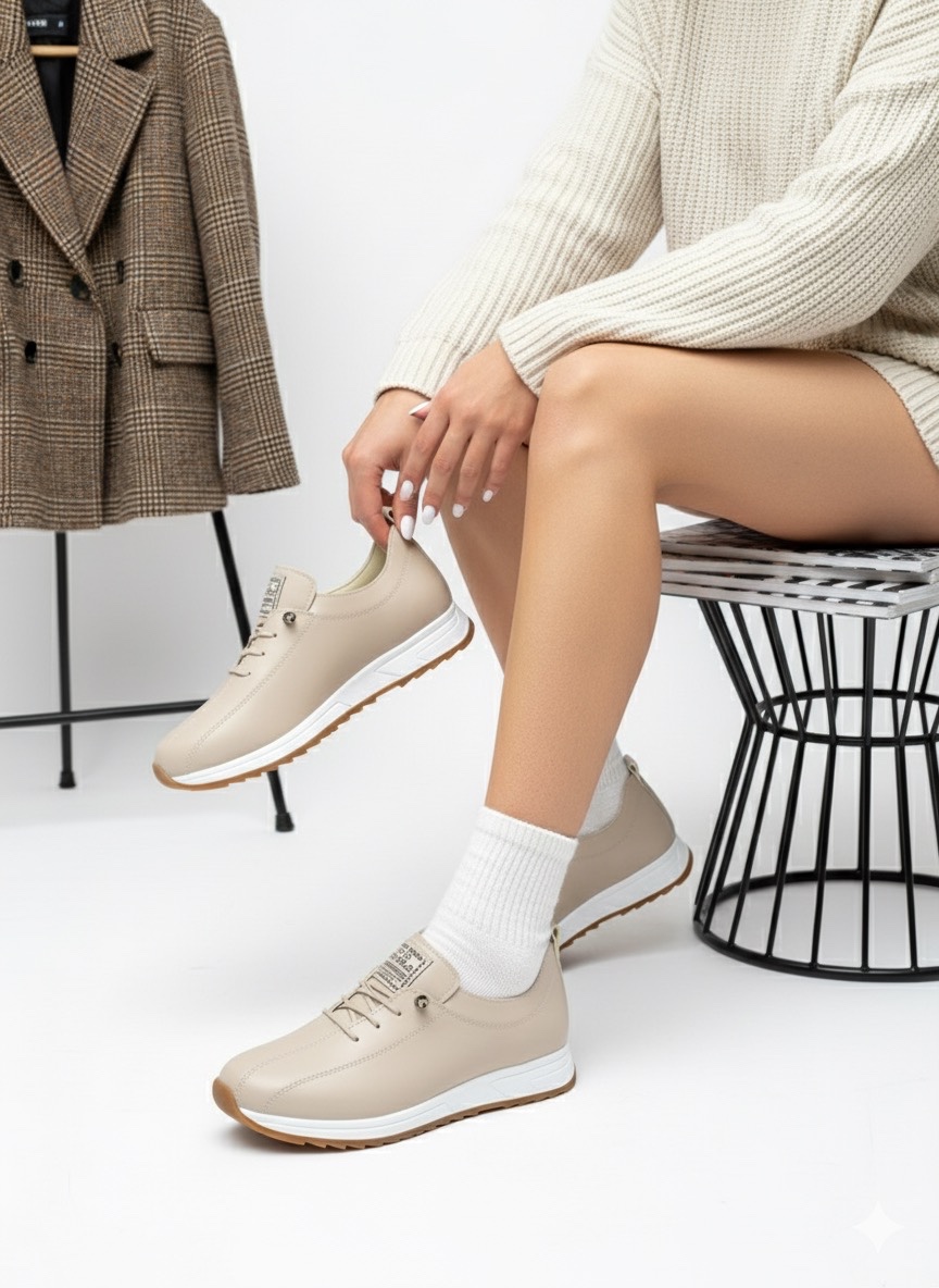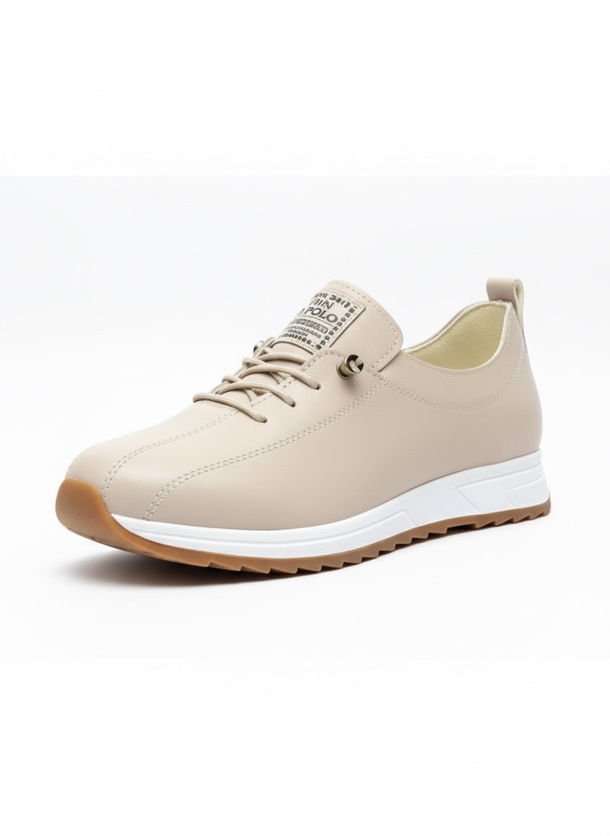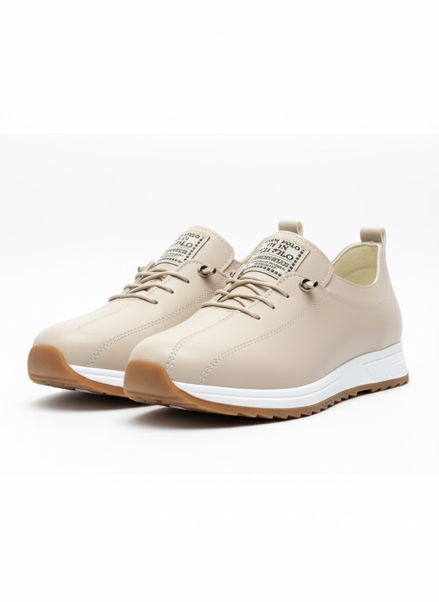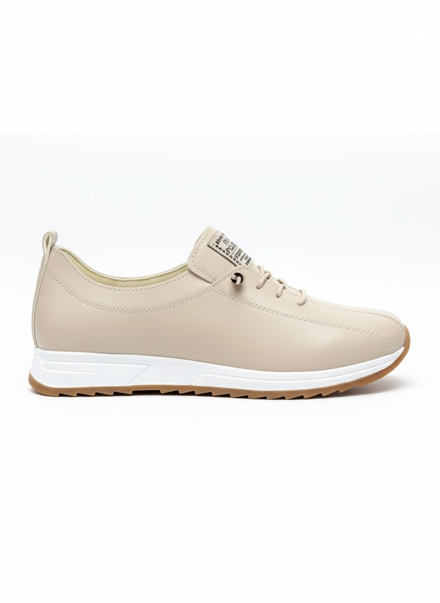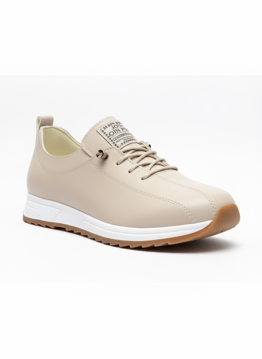 Gündelik stilinizi konforla buluşturun! Bu modern bej kadın sneaker modeli, yüksek kaliteli suni deri (vegan deri) malzemeden üretilmiştir. Hayvan dostu dış yüzeyi, hakiki derinin zarif görünümünü sunarken, bütçe dostu ve kolay temizlenebilir bir alternatif arayanlar için idealdir.